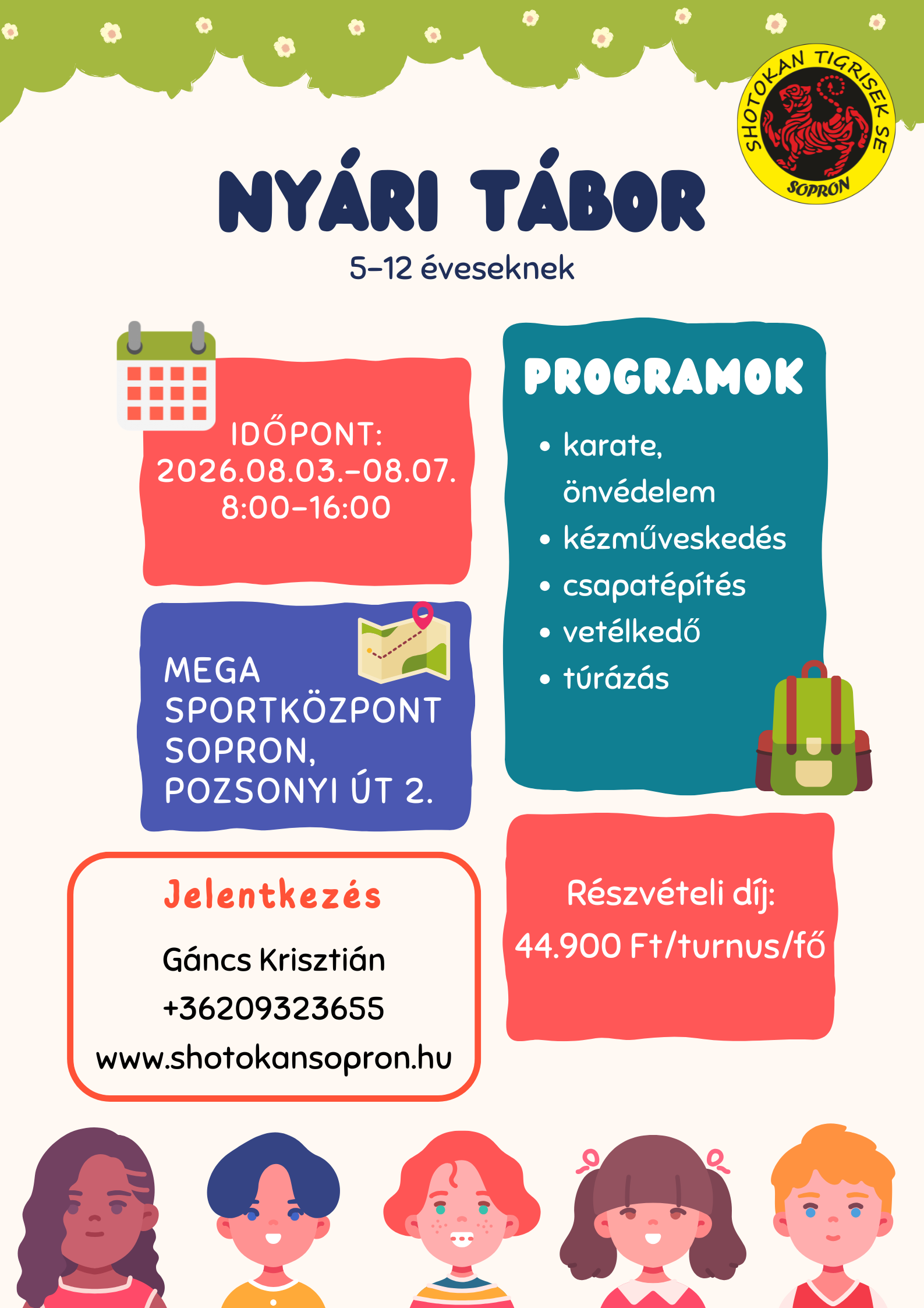 Egyesületünk 2026. augusztus 3 - augusztus 7. között nyári tábort szervez 5-12 éves gyerekeknek a Megasportban (Sopron, Pozsonyi út 2.). Várunk minden mozogni vágyó gyermeket változatos programokkal.